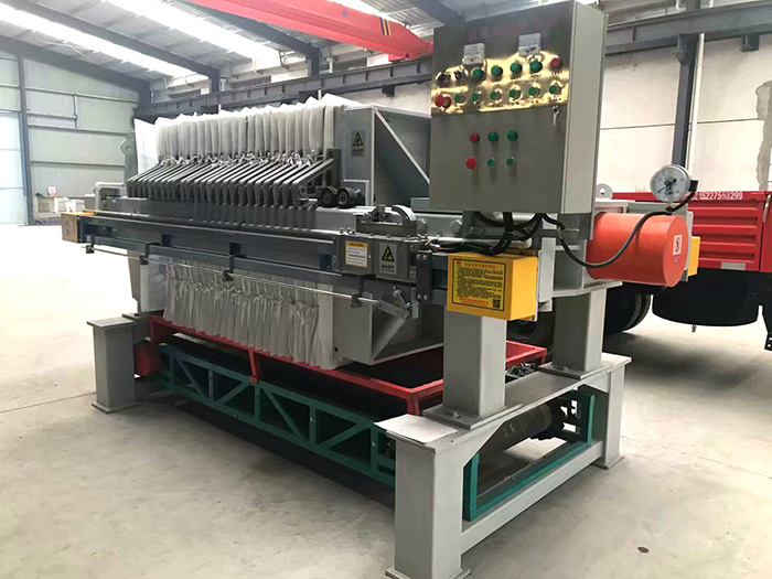 在運(yùn)行過程中,濾漿從濾框上角的孔流入過濾器電樞,濾室壓濾機(jī)的濾液沿濾板上的溝渠向下流動(dòng),并從濾板末端的小管排出,而咸的過濾渣留在濾架內(nèi)形成過濾和過濾。"當(dāng)過濾殘?jiān)畛湓诳騼?nèi)時(shí),箱式壓濾機(jī)停止操作,松開濾板和框,取出濾芯,取出箱內(nèi)的濾餅,然后清洗濾框和濾布,再重新安裝濾布。為準(zhǔn)備另一次過濾,清洗,將洗衣盤沖洗成羊皮濾布和蛋糕,聚集在下端的非洗滌板出口流出處。